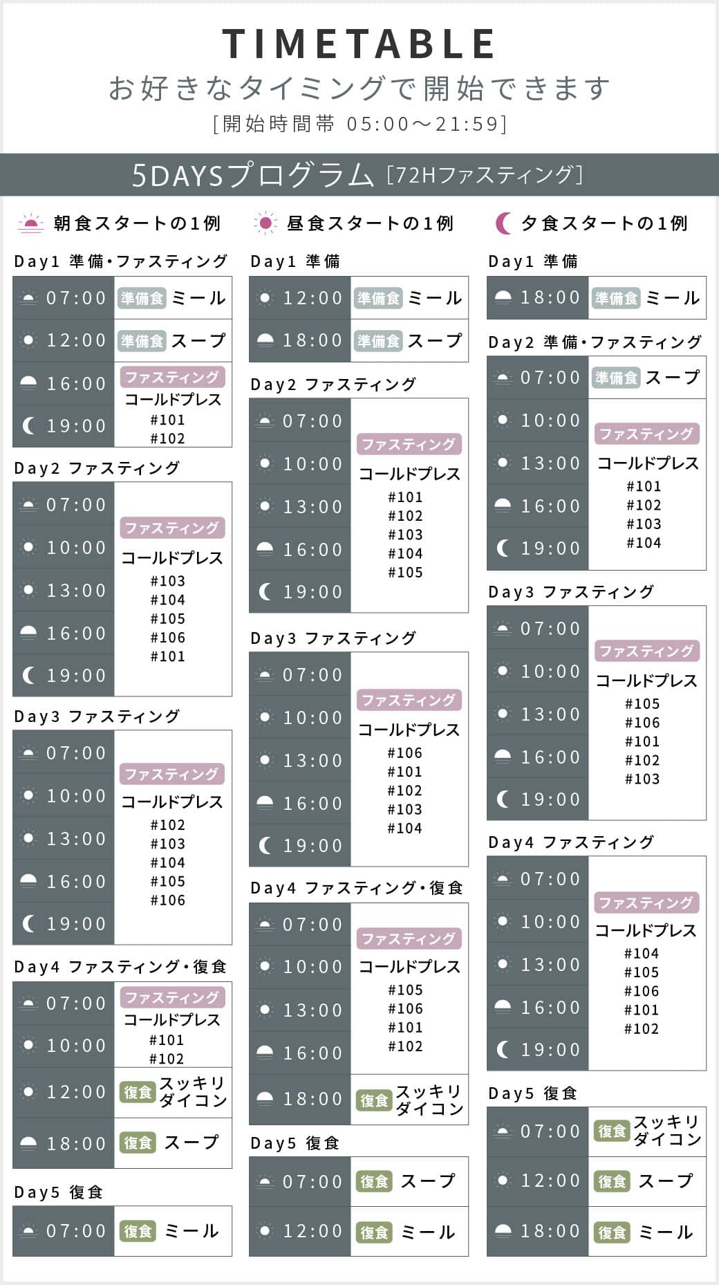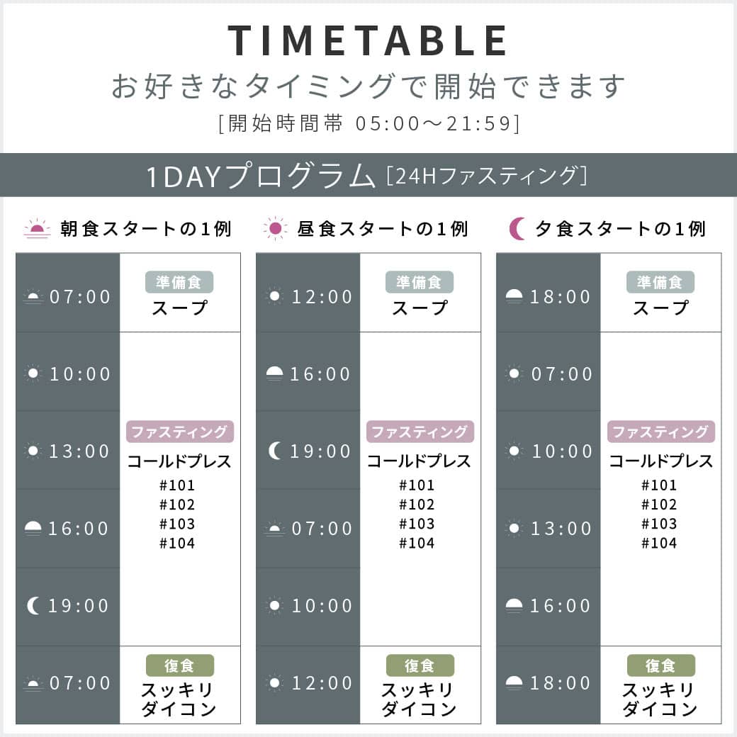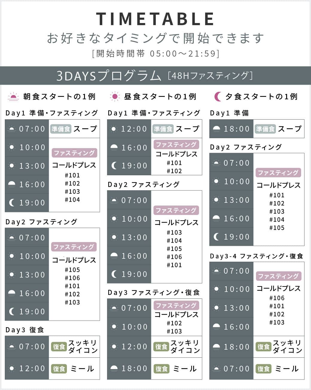 1dayプログラム(24時間ファスティング+準備・復食)、3daysプログラム(48時間ファスティング+準備・復食)、5daysプログラム(72時間ファスティング+準備・復食)があります。